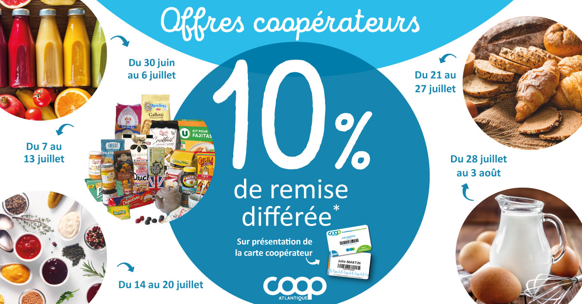 Coopérateurs, c'est à vous d'en profiter ! Dans tous nos hypermarchés et supermarchés sous enseigne Hyper U, Super U, U Express et Utile, chaque semaine, vous bénéficiez de 10% de remise différée* sur un rayon ou une famille de produits, créditée sur votre compte coopérateur, sur présentation de votre carte coopérateur.