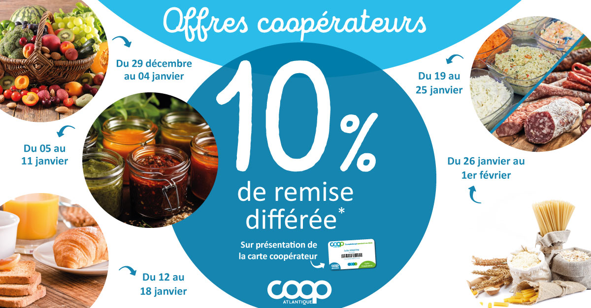 Coopérateurs, c'est à vous d'en profiter ! Dans tous nos hypermarchés et supermarchés sous enseigne Hyper U, Super U, U Express et Utile, chaque semaine, vous bénéficiez de 10% de remise différée* sur un rayon ou une famille de produits, créditée sur votre compte coopérateur, sur présentation de votre carte coopérateur.